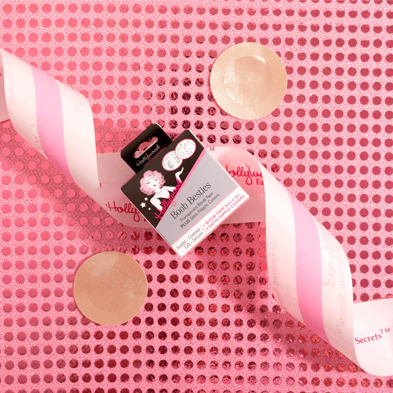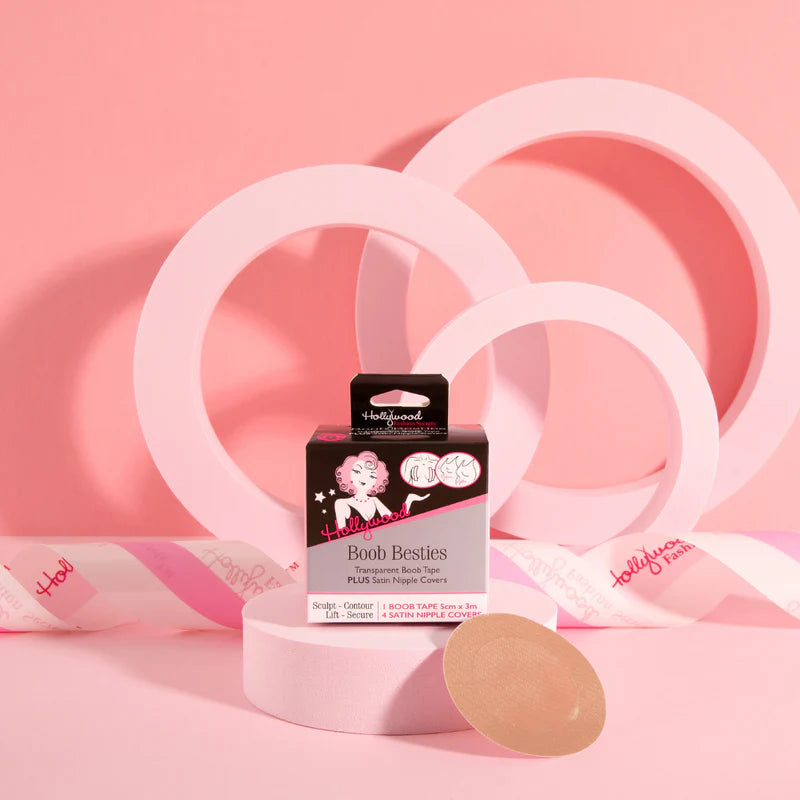 Meet your ride-or-die for daring necklines and strapless styles - Hollywood Fashion Secrets Boob Besties. This dynamic duo has your back (and front) with 5 metres of Transparent Boob Tape and 4 discreet Satin Nipple Covers. It's everything you need to lift, shape, and slay - no bra required.